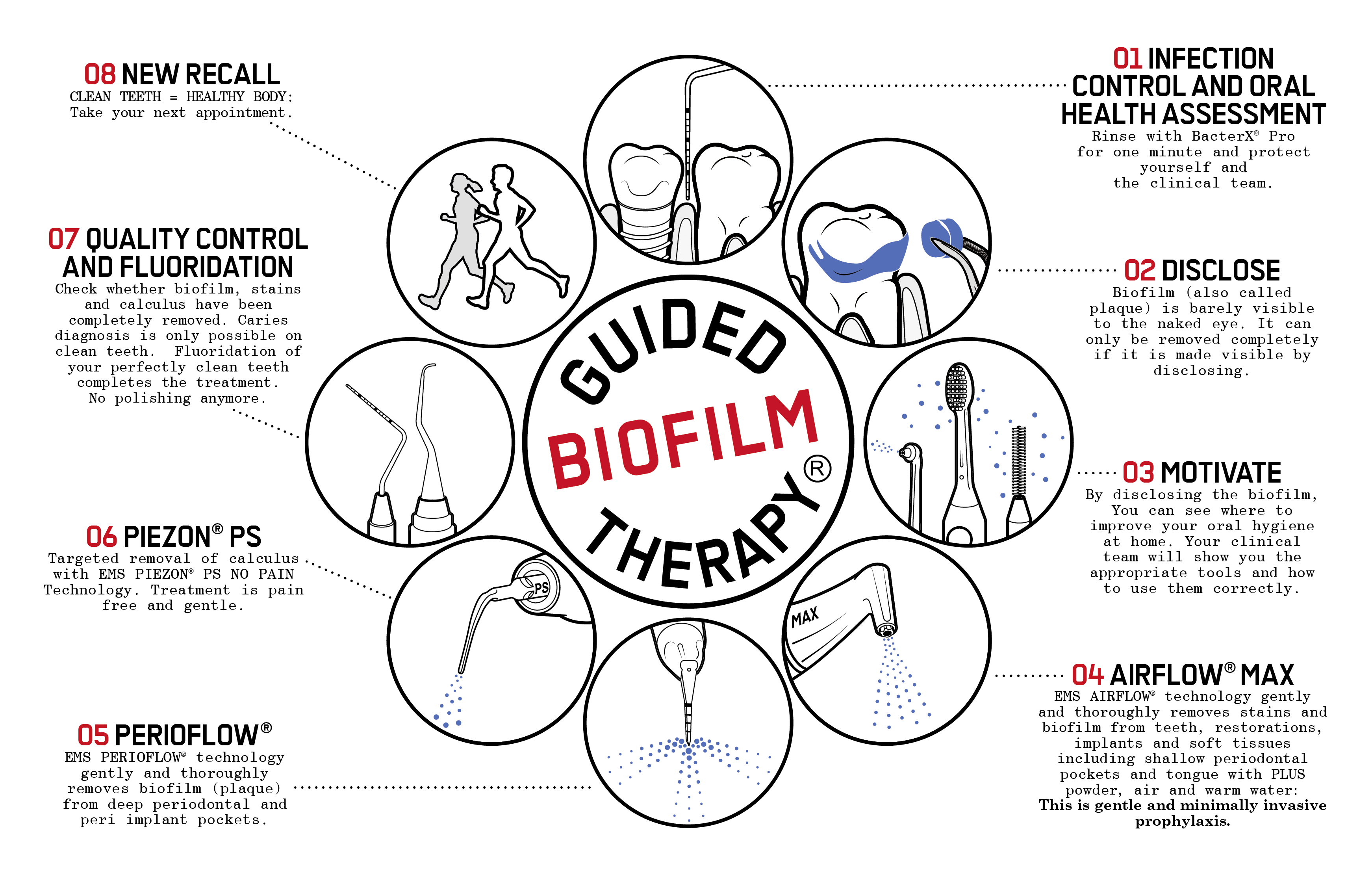 Guided Biofilm Therapy (GBT) é um protocolo sistemático, baseado em evidência científica para prevenção, profilaxia e terapia da saúde oral. É projetado de forma modular e pode ser aplicado a todos os pacientes de acordo com a tratamento.
